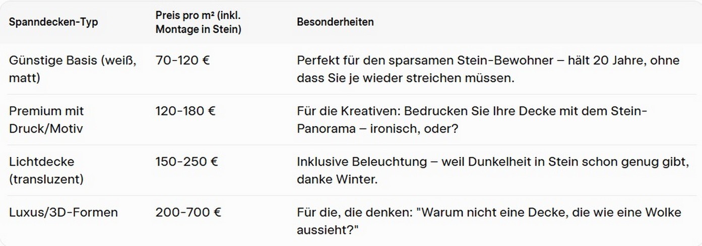 Jetzt zum Geld: Preise In Stein starten wir bei 29,90 € pro m² für einfache PVC-Decken inklusive Montage. Mit Beleuchtung oder Design: 50–150 €/m². Lieferung aus Nürnberg? Kostenlos für Stein – wir sind ja Nachbarn! Für 20 m²: Ca. 600–2000 €, je nach Schnickschnack. Einzigartige Zitate aus Stein: „Bei Dekorchoice zahle ich für Qualität, nicht für Luftballons! Meine Decke kostete 900 € und spart mir Heizkosten.“ (Frau Müller aus Deutenbach).